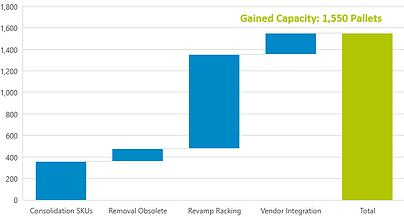 The consolidation of SKUs, disposal of obsolete inventory and revamp of racking will free up ~25% of storage capacity within the existing footprint. Redesign of processes and material flows will reduce warehouse headcount by ~20%.